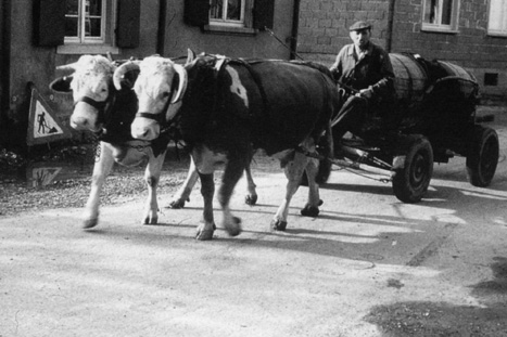 Stall. Auch die Kühe mussten den Wagen ziehen, wurden zum