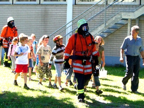 Feuerwehrleute und Lehrer begleiteten die Schüler über die