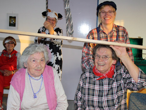 Den Bau eines Fahrstuhls für ihren Raum im Feuerwehrhaus haben sich die DRK-Helferinnen während der Seniorenfasnacht zur Aufgabe gemacht. Foto: Marco Karch