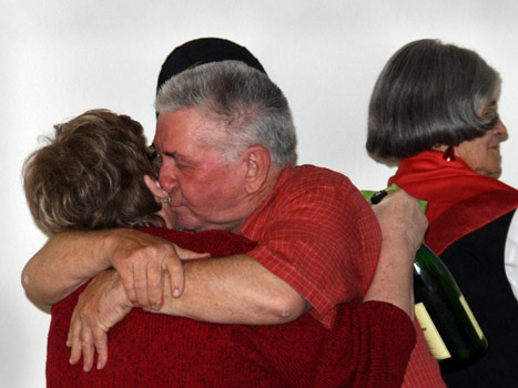 Zum Abschied einen Schmatz: Fritz Vogt bedankt sich zum Abschied bei DRK-Mitglied Ursel Geiger für das Dankeschön-Geschenk. Foto: Marco Karch