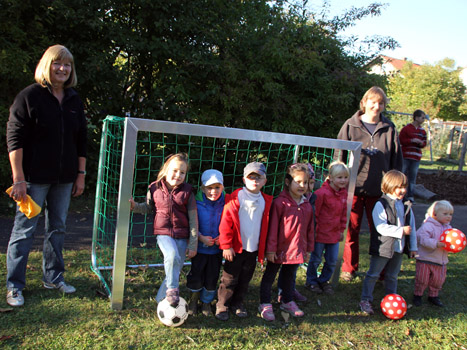 Erzieherinnen die Sachspende, ein Mini-Fußballtor beim