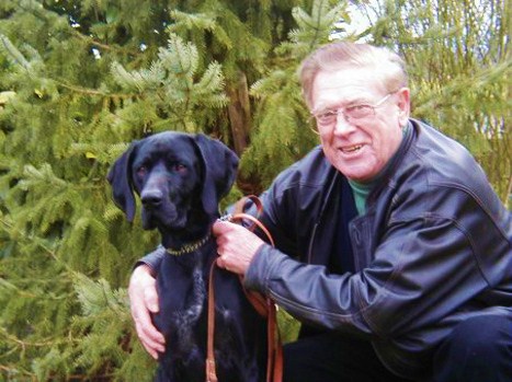 draußen mit seinem Hund Arco, einem deutschen Kurzhaar. Das hält