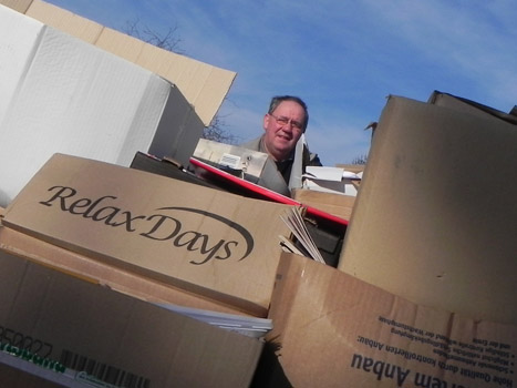 Werner Keck mit einem Riesen-Karton, der sich kaum von der